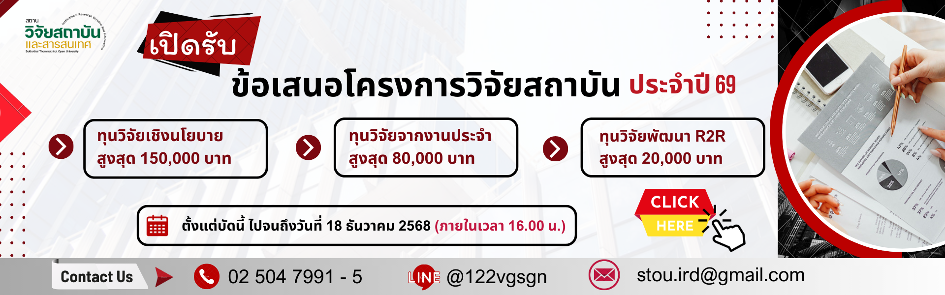 banner ข้อเสนอ 69 (3)EdPEx 67 DownloadPR_BnsBanner-1-Resize-1Banner-Line-Resizeiru2Banner-2-Resize สร้างสรรค์และสนับสนุนงานวิจัยที่ตอบสนองต่อการดำเนินงานและพัฒนามหาวิทยาลัยสนับสนุนและติดตามการวิจัยสถาบันให้สามารถนำไปใช้ในมหาวิทยาลัยได้จริงถ่ายทอดข้อมูลและองค์ความรู้จากงานวิจัยสถาบันให้กับหน่วยงานที่เกี่ยวข้องเพื่อพัฒนาและส่งเสริมงานวิจัยสถาบัน จำนวนงานวิจัยที่แล้วเสร็จ โครงการ 0 ฐานข้อมูลงานวิจัย เอกสารที่เกี่ยวข้อง ดาวน์โหลดแบบฟอร์ม Infographic บุคลากร จำนวนผู้เข้าชม: 13,416